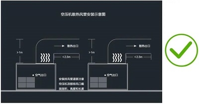 6、進風口需避免西曬太陽,造成環(huán)境溫度上升,高溫報警。如果工廠環(huán)境較差,灰塵多,應加裝一通風導管,將進氣端引向空氣比較干凈的地方。導管的安裝必須便于拆裝,以利維修,安裝尺寸參考空壓機外部尺寸。